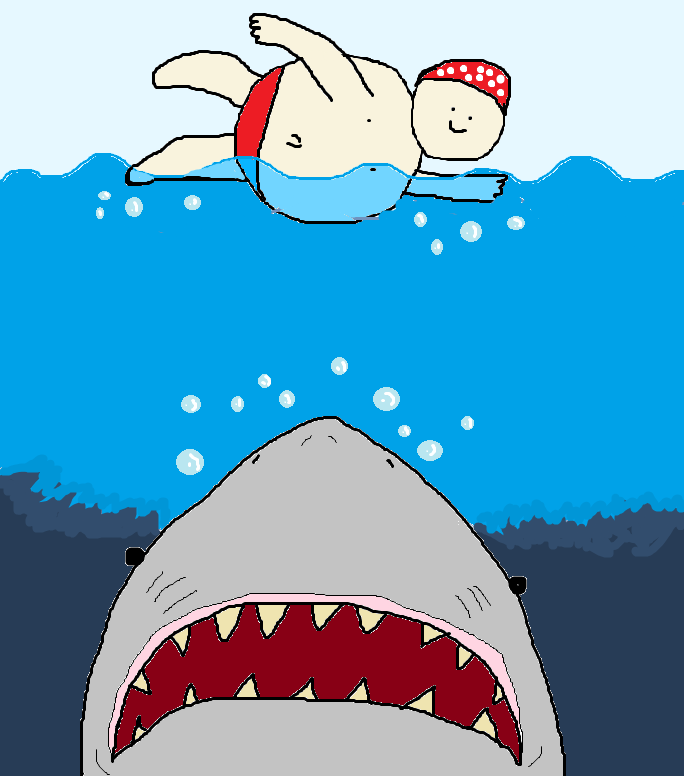 My jednak postanowiliśmy ukazać ekranizację w zupełnie nowym, grubym świetle. Spójrzcie tylko na tego uroczego Grubola – on jeszcze nie wie, że zaledwie kilka metrów pod nim znajduje się oceaniczny potwór. Pływa sobie spokojnie w swoim uroczym czepku w kropki i nie przeczuwa najgorszego. Jak to się skończy? Czy Grubol przeżyje? A może pokaże rekinowi gdzie jego miejsce i ocali pobliskie plaże?